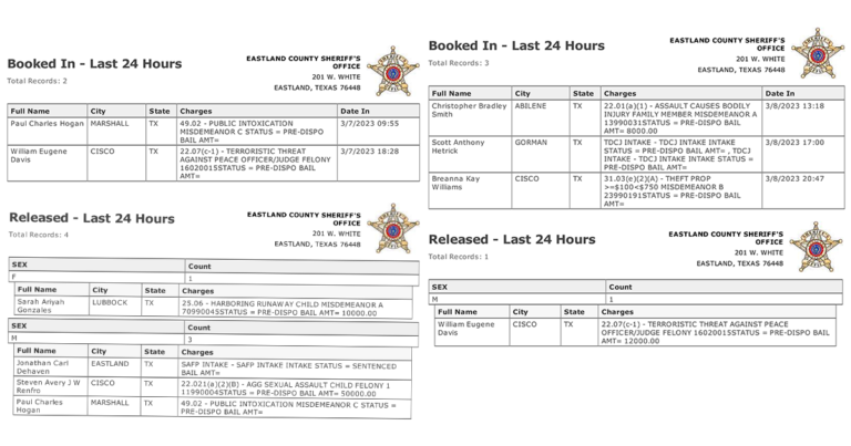 Eastland County Jail Activity Last 24 Hours. Reports March 8 & 9, 2023…