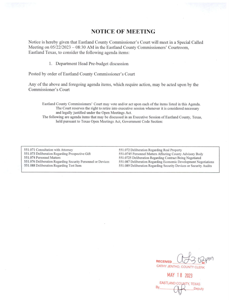 Agenda for a Special Called Meeting of the Eastland County Commissioners’ Court to be held on May 22, 2023…