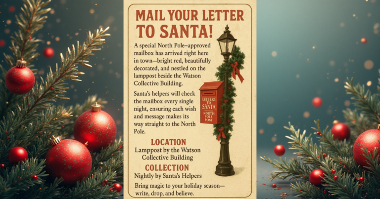 Christmas magic has arrived on Main Street! You’ll find Santa’s bright red mailbox wrapped in garland and cheer on the lamppost right beside the Watson