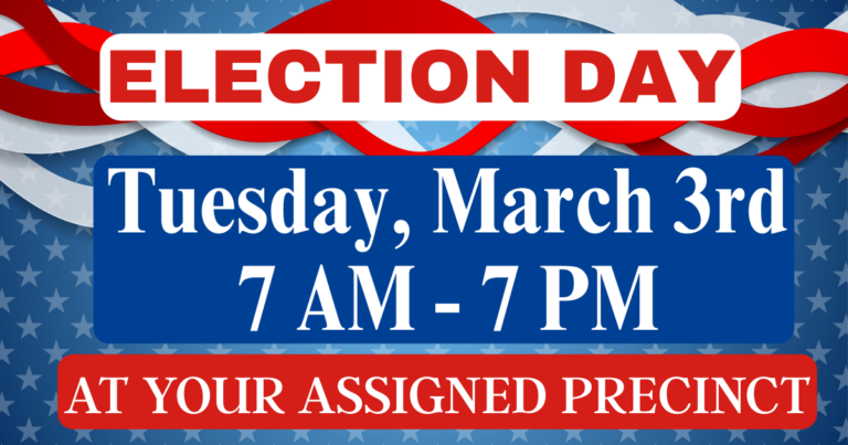 Primary Election March 3, 2026. Early voting February 17 – 27. Voting on Election Day must be done at your assigned precinct.