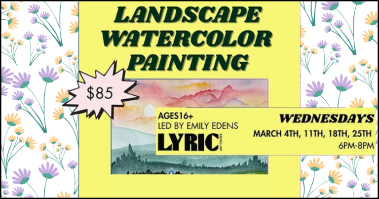 Discover the joy of painting landscapes with watercolors in this beginner-friendly class. March 4, 11, 18 & 25 at the Lyric Arts Center…
