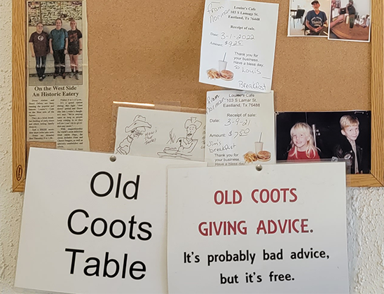 There’s been a gathering of coffee drinkers, solving the world’s problems around an oval table at a little cafe in downtown Eastland for the past 46 years. A sign hangs above the table reserving it as the “Old Coots Table”. The faces of those Old Coots have changed through the years, but the good-natured jabs and the loyalty to the cafe have remained the same. It’s a spot highly recommended for those eggs over easy, biscuits with gravy, a juicy hamburger, chicken strips, or, my favorite…a ham & cheese club sandwich. It’s a small place with few places to sit, but that’s always been part of its charm. The sound of the screen door slamming behind you as you enter will just be a memory after Thursday because that’s when owner, Diana Ahrlett will be closing Louise’s Cafe for good.