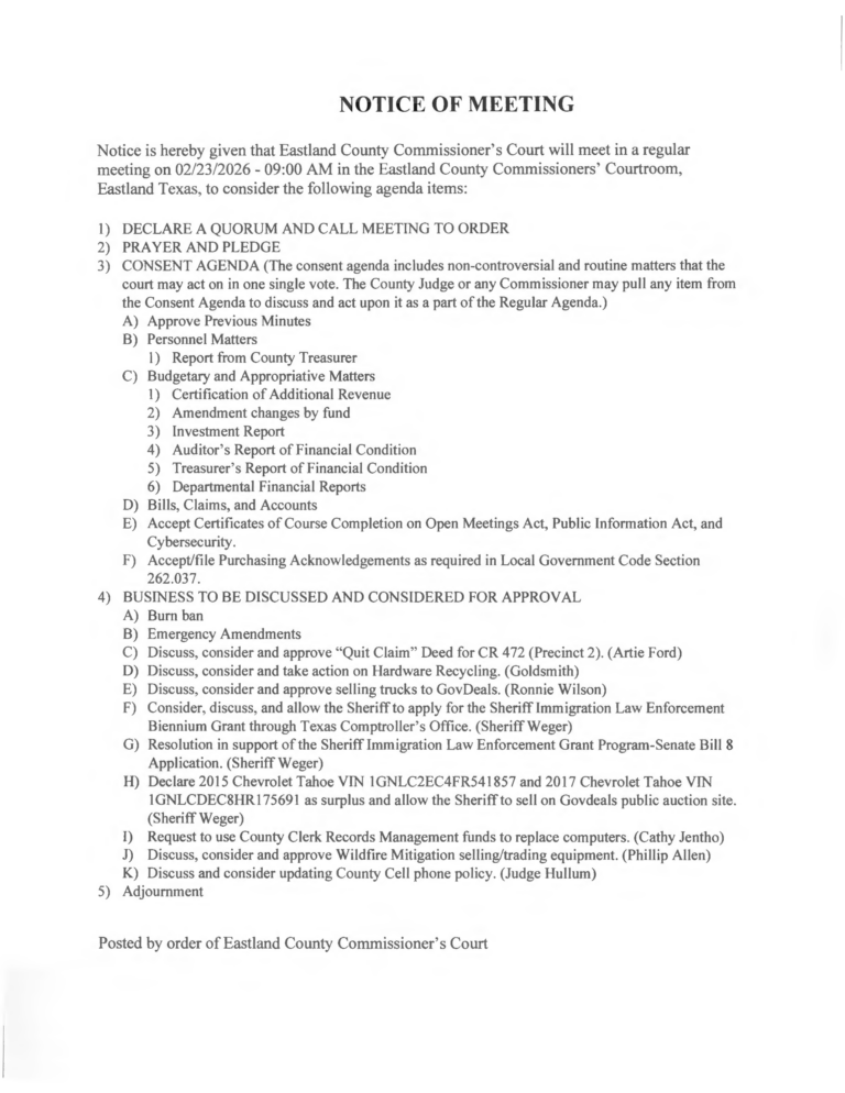 Eastland County Commissioners’ Meeting, February 23, 2026. There will be no livestream of this meeting.