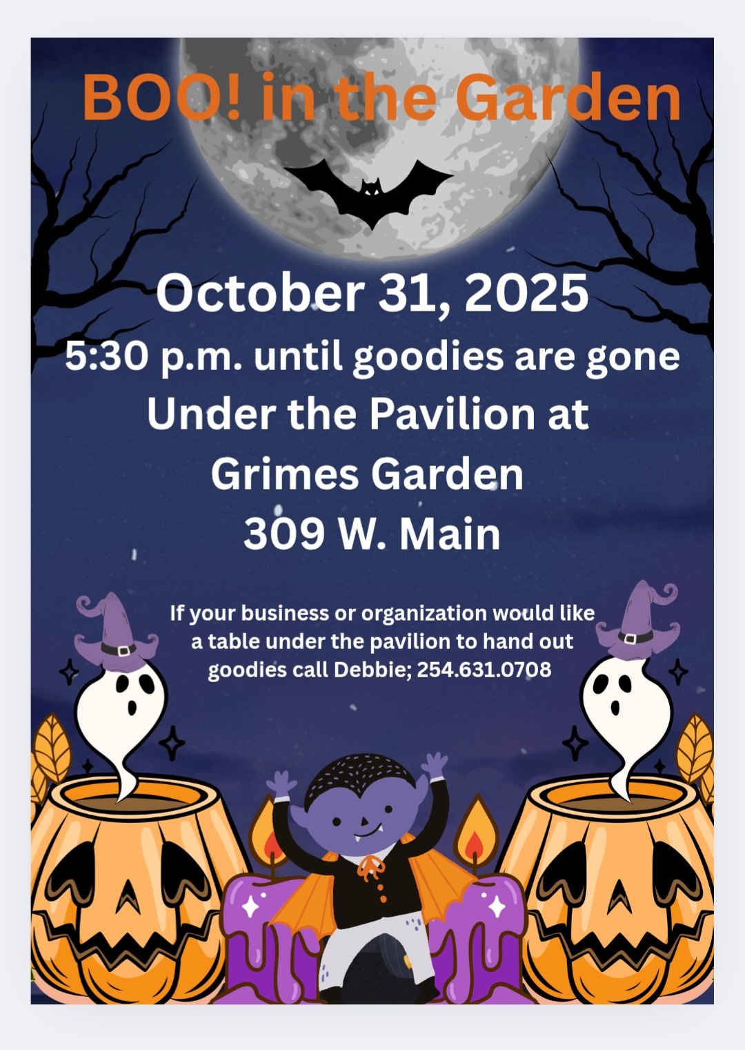 BOO! in the Garden, October 31st at Grimes Garden, Eastland