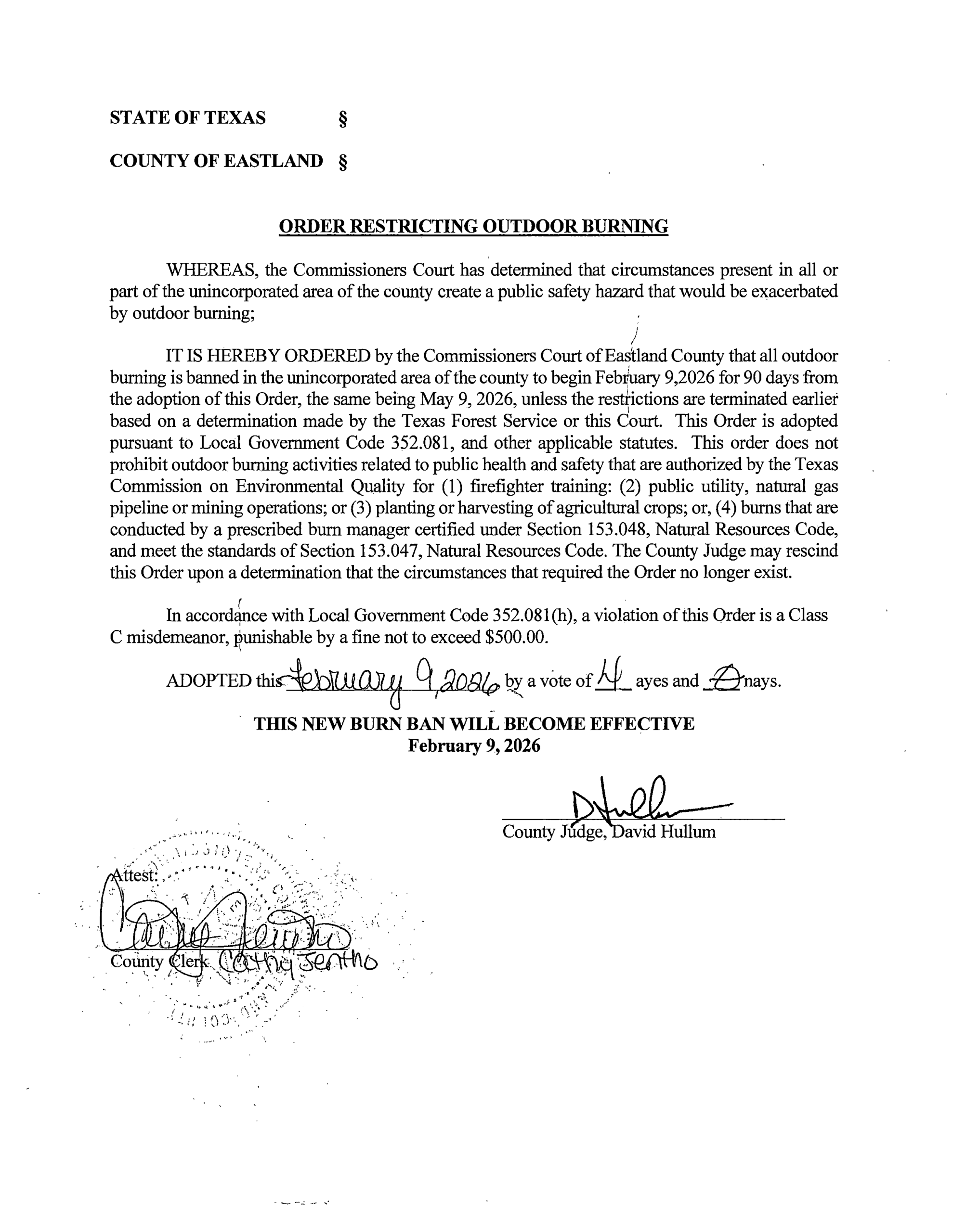 At this morning’s Commissioners’ Court meeting, the Eastland County Commissioners unanimously voted to enact a burn ban, effective immediately.