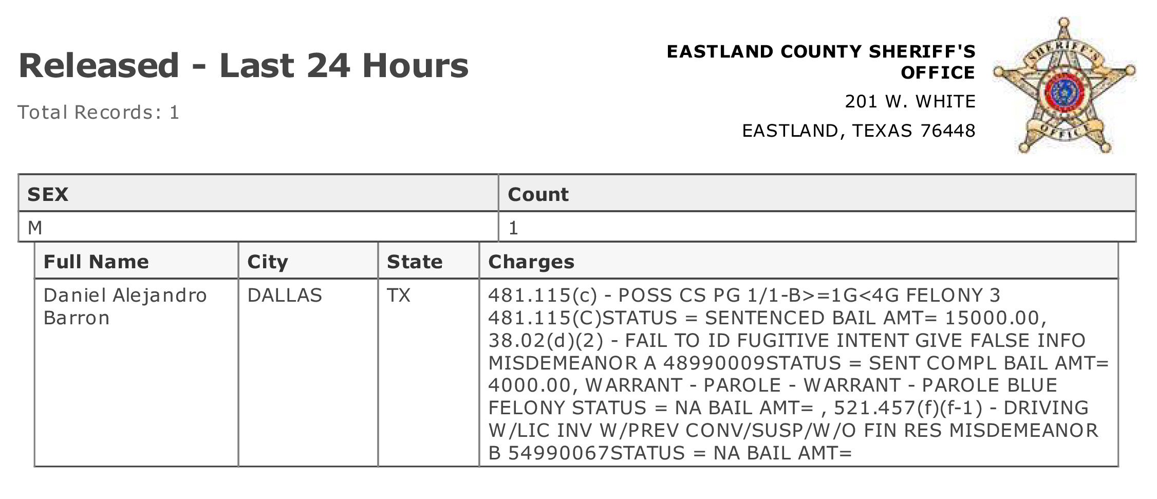 EASTLAND COUNTY JAIL ACTIVITY LAST 24 HOURS, OCTOBER 10, 2023