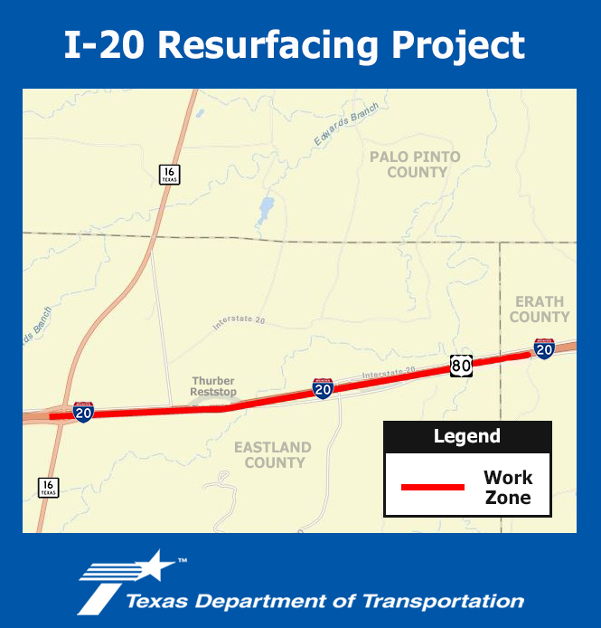 EASTLAND COUNTY– Beginning Monday, August 4, 2025 (weather permitting) work to perform a resurfacing project will begin on all travel lanes of I-20 between State Highway (SH 16) and the Erath County Line.