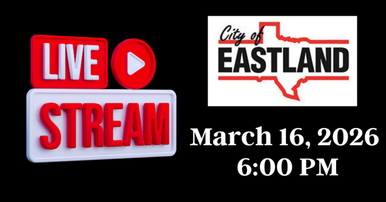 Livestream and agenda for the Eastland City Commissioners’ meeting, March 16, 2026 at 6 PM.